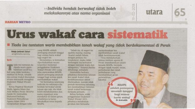 IPOH, 18 MAY 2016 – The Cheque Presentation Ceremony of RM100,000 to Taman Jati Mosque was held at 10.00 a.m. in the Meeting Room, Level 5, Majlis Agama Islam dan ‘Adat Melayu Perak (MAIPk). MAIPk, represented by Tan Sri Dato’ Seri (Dr.) Haji Harussani, presented a contribution of RM100,000.00 from the Wakaf Perak Al Ridzuan…