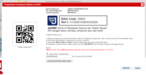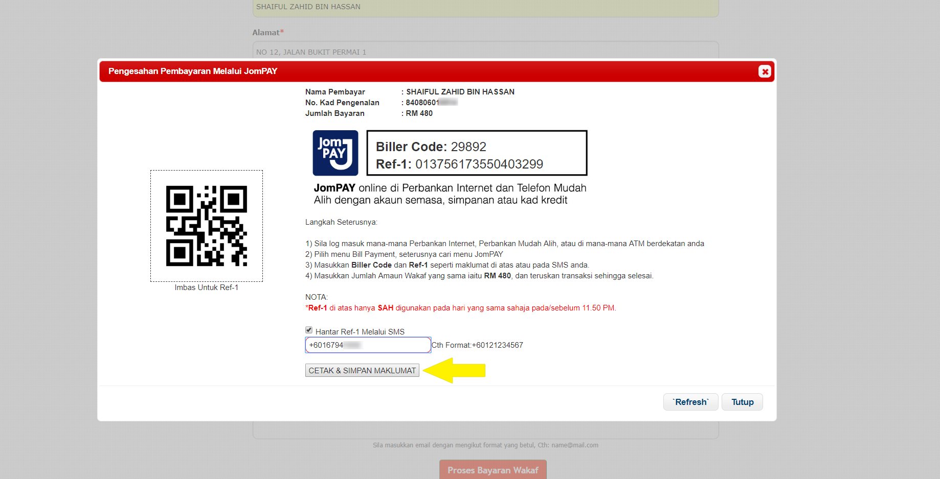 9. Setelah itu, paparan Pengesahan Pembayaran Secara JomPAY akan dipaparkan. Sila ikuti langkah-langkah yang dipaparkan untuk meneruskan bayaran secara JomPAY. Untuk menerima SMS Biller Code dan Ref-1 di telefon bimbit, masukkan no. telefon bimbit diruang yang disediakan dan pastikan kotak “Hantar Ref-1 melalui SMS” ditanda. Setelah itu klik butang “CETAK & SIMPAN MAKLUMAT”. Ref-1 juga boleh didapati dengan mengimbas kod QR yang dipaparkan dengan menggunakan aplikasi pengimbas kod QR yang dipasang di telefon bimbit.