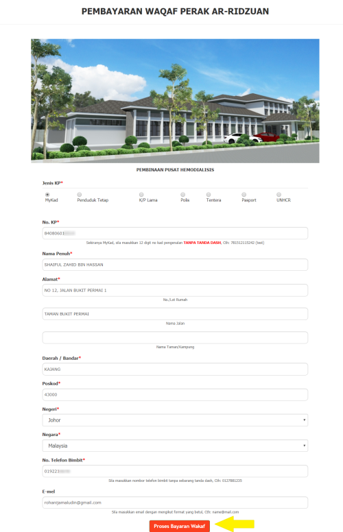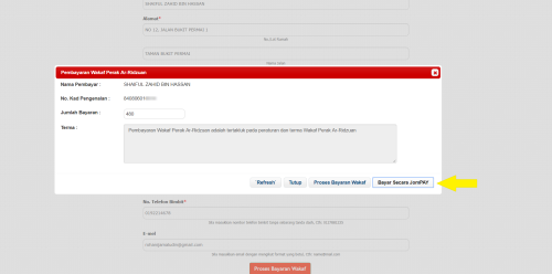 3. Setelah itu, paparan Pembayaran Wakaf Perak Al Ridzuan akan dipaparkan, sila isi semua ruangan yang disediakan dan klik butang Bayar Wakaf Perak Al Ridzuan.