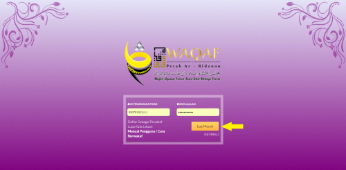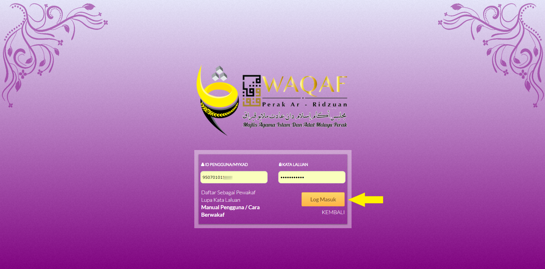 4. Paparan Pendaftaran Berjaya akan dipaparkan, seterusnya anda akan dibawa kepaparan log masuk pewakaf, sila masukkan ID Pengguna dan Katalaluan anda dan klik butang Log Masuk.