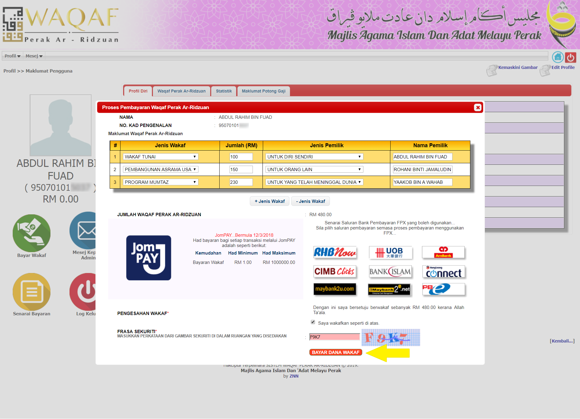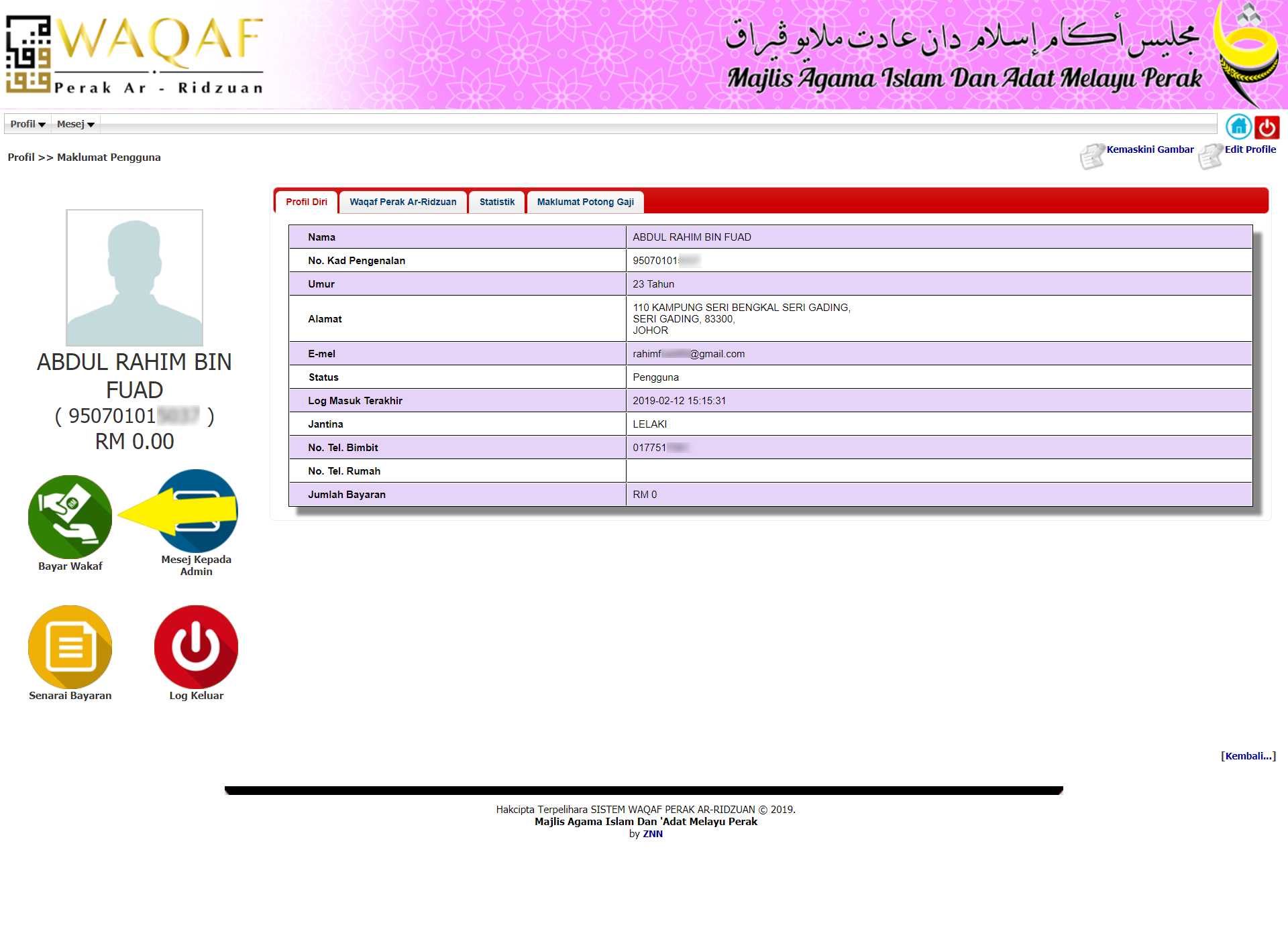 6. Paparan profil seperti rajah dibawah akan dipaparkan setelah berjaya log masuk ke dalam sistem. Untuk membayar wakaf, klik butang Bayar Wakaf.
