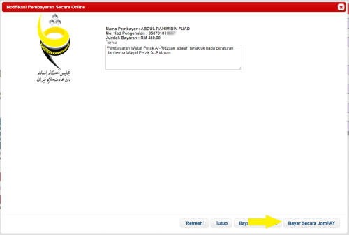 10. Setelah itu, paparan Pengesahan Pembayaran Secara JomPAY boleh ditutup.