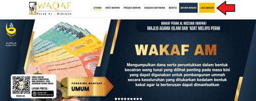 3. Untuk mendaftar sebagai pewakaf, klik butang Daftar/Log Masuk Pewakaf, anda akan dibawa ke paparan log masuk pewakaf seperti rajah dibawah, klik pautan Daftar Sebagai Pewakaf.